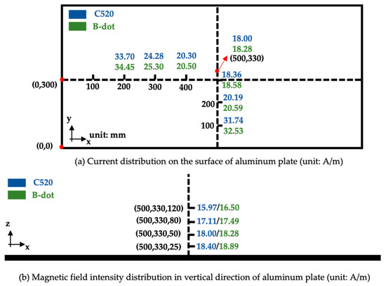 Comparison of C520 and B-dot in measuring the surface current distribution and magnetic field strength of the aluminum plate.