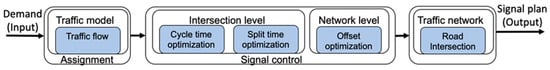 Adaptive traffic signal control approaches, including SCOOT [] and SCATS [], have been widely used in real-world traffic networks. They are based on an open-loop control system that does not consider feedback control in the traffic network (Figure 1). They use a cyclic system with pre-determined time intervals, which means the controller updates the signal timing plan (cycle length, green signal ratio, and phase difference) at a specific time interval []. Studies show that the traffic flow at intersections may vary significantly in major cities due to the fluctuation of traffic demand [,]. Nevertheless, these typical adaptive traffic signal control systems cannot respond to such travel demands (traffic flow varies at shorter time intervals) [] and require complex computation schemes that make their implementation costly []. This can increase travel delays for road users.