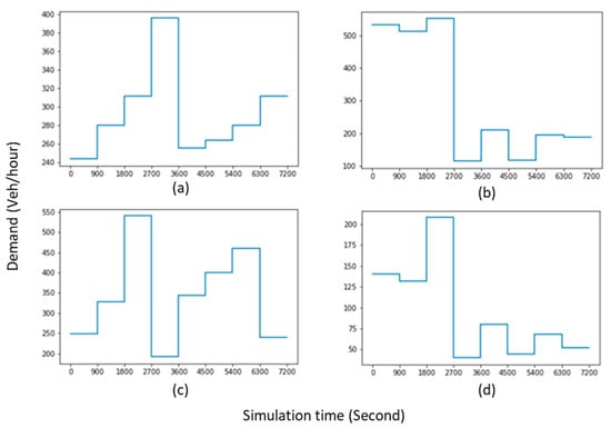 In this paper, PTV VISSIM microsimulation software was used to investigate the impact of the proposed framework on performance measures such as queue length and stop delay. Therefore, akin to some relevant studies [,], an isolated four-leg signalised intersection was employed in this study (north entry has one line, whereas other approaches have two lines). This intersection has been taken from a sample example in VISSIM (used as a template to show the benefits of three-stage vehicle actuated signal control over fixed time) to represent the functionality of the proposed method in dynamic traffic demand. As shown in Figure 2, time-varying arrival rates were generated based on the VISSIM example at 15-min intervals for two hours to consider the fluctuation of traffic demand in a real-world network.