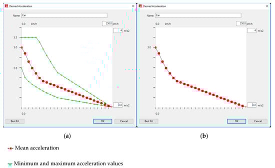 Desired acceleration functions of a conventional vehicle and an autonomous vehicle in VISSIM []. (a) Conventional vehicle; (b) Autonomous vehicle.
