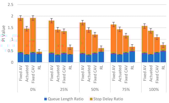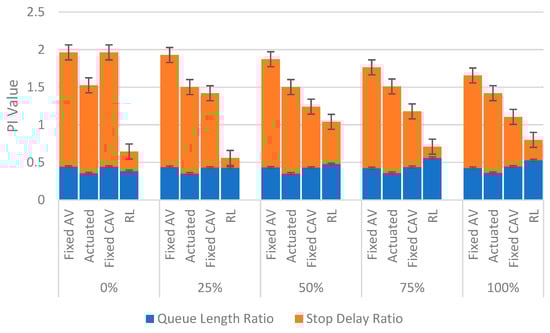 PI values were analysed for both saturated and oversaturated scenarios. One of the unforeseen outcomes which can be highlighted in Figure 4 is that the PI value suddenly escalates when moving from 25% to 50% for the RL. In order to better perceive this trend, we present PI variation in the unsaturated condition for these two aforementioned CAV scenarios. The final results are displayed in Figure 6.