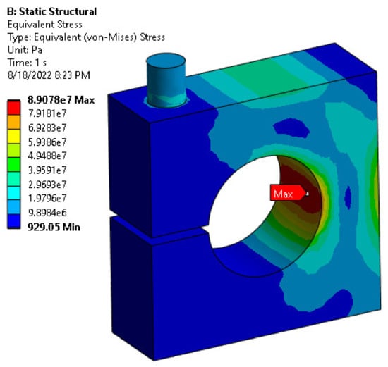 In the analysis, two boundary conditions were defined based on the actual mounting operation of the load cell. As shown in Figure 7, since the load cell is fixed to the base with a bolt, a fixed support is applied to the bottom surface of the load cell, and the external force is applied to the load point at a distance of 5 mm from the nearest edge. The capacity of the load cell designed in this study is 300 N as the maximum applied force.