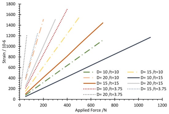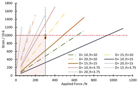 The limitation factors for choosing the optimal parameter value for the load cell are determined based on the allowable stress and strain, 138 MPa and 1000 microstrain, respectively. Figure 10 shows the allowable range of values determined based on the limiting factors. Therefore, the optimal values for the hole diameter (D) and body thickness (t) were selected as 15, and 10 mm, respectively, since it is the nearest line that could achieve the design values, as seen in Figure 11 and Figure 12, which show the relationship between the applied load and generated strain on the load cell for the optimized parameters through FEM analysis. Additionally, the FEM analysis of the model with these optimized parameters is displayed in Figure 8 and Figure 13.