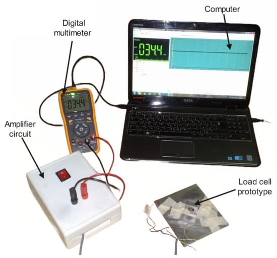 The actual implantation of the amplifier circuit is shown in Figure 16. The load cell is attached to a Wheatstone bridge instrument with an analog amplifier to increase the bridge’s signal level by a factor of 2001. This study utilized a linear strain gauge (CEFLA-3-23, Tokyo Measuring Instruments Laboratory Co., Tokyo, Japan) with a gauge length of 3 mm, a backing length of 6.9 mm, and a resistance of 120 Ω. The strain limit of this strain gauge is 1% (10,000 microstrain) and the gauge factor (GF) is 2.09 [45]. The other strain gauge specifications are special alloy foil for the grid, polyimide resin for the backing material, and self-temperature compensation for aluminum. The output of the amplifier circuit ( and ground) is fixed to the instrument digital multimeter (Digital Multimeter VICTOR 70C). This multimeter interfaces with the computer by USB cable to display and record the data logging, processing, and analysis. The specifications of the amplifier circuit are illustrated in Table 2.
