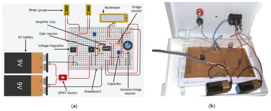 Implementation of the amplifier circuit: (a) Graphical description of the load cell circuit board; (b) Description of the actual amplifier circuit.