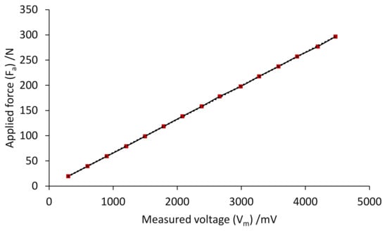 The load cell calibration was carried out in the experimental setting by employing known accredited mass loads at the load application spot to characterize the sensitivity and design of the load cell. These masses were verified based on the standard weight set specifications. These calibration tests are widely used in various load cell calibrations [39]. In the calibration experiment, two goals were pursued. First and foremost, measurement of the load cell’s sensitivity and linearity (also known as the calibration slope) was crucial. Secondly, the calibration should be carried out before any force measurement on the load cell to balance the bridge by adjusting the bridge’s output voltage through the variable resistor until the voltmeter reads zero volts. Primarily, the bridge’s output generated a non-zero initial offset voltage when no load was applied because of the slight variation in resistance among the bridge arms.