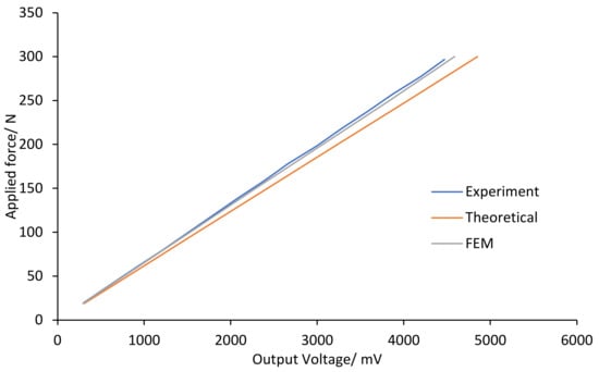 Output voltage versus applied load for the theoretical, FEM, and experiment.