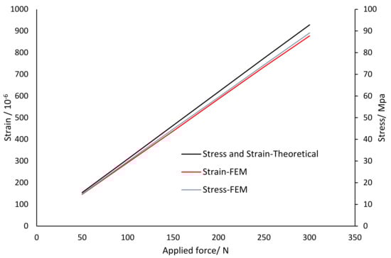 The theoretical calculation was based on the mathematical model equations of the load cell and the simulation results, which were based on FEM. The stress and strain curve corresponding to the applied load is given in Figure 19 for the theoretical and simulation (FEM) results. In the strain and stress analysis, the simulation results are lower than the theoretical results by 5.4% and 3.7%, respectively.