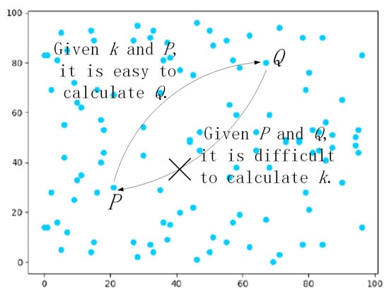 - The elliptic curve discrete logarithm problem (ECDLP): Figure 4 demonstrates points distributed over an elliptic curve in finite field . Selecting two points Q and P in Figure 4, where satisfy , where k is between 0 and 96 at random. Given k and P, it is easy to figure out Q by a scalar multiplication and addition rules. Nevertheless, given Q and P, it is difficult to calculate k.