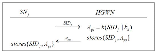 Sensor registration process is shown in Figure 6. assigns a unique identity to each sensor node. sends its own identity to the nearest via a secure channel for registration. Then, the calculates and stores in its memory. After that, the sends to via a secure channel. After receiving from the , stores in its own memory.