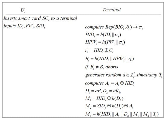 inserts their smart card to a terminal, and inputs identity , password and biometric information . Then, the terminal reproduces the biometric key data through the fuzzy extractor, namely . The terminal computes , , and . Subsequently, the terminal checks whether . If the equation is not held, at least one parameter is incorrect, which leads to the login request being refused by the terminal and no subsequent authentication process being performed. Otherwise, ’s login is successful, and the terminal generates a random number , and a timestamp . At last, the terminal computes , , , , , and . This process is demonstrated in Figure 7.
