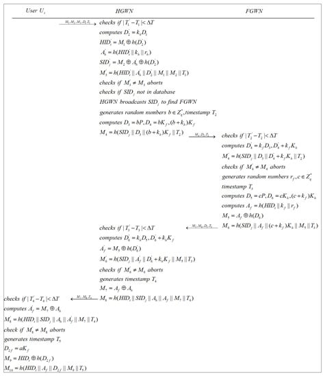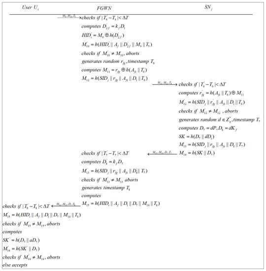 Nevertheless, in traditional single-gateway WSNs, high-speed data streams are prone to conflict during data aggregation, because the distance between edge sensors and the gateway node is too far, which may cause an increased communication cost and reduced performance. In this case, multigateway protocols are required, and Figure 3 shows the model we used. This architecture is an extension of Figure 2. The user sends the authentication message to the HGWN. Following that, the HGWN checks the validity of the received message. In the event that this procedure is successful, the HGWN sends a message to the FGWN. The FGWN transmits a message to the HGWN after confirming the message’s availability. Then, the HGWN checks the received message and delivers a message to the user. Following steps 1–4, the mutual authentication is achieved between the user and the FWGN. After that, user sends a message to the FGWN for further authentication. After the verification is successful, the FGWN transmits a message to the sensor. Subsequently, the sensor computes the session key and delivers a message to the FGWN. Finally, the user figures out the session key used for subsequent communication after confirming the message that the FGWN sent to it.