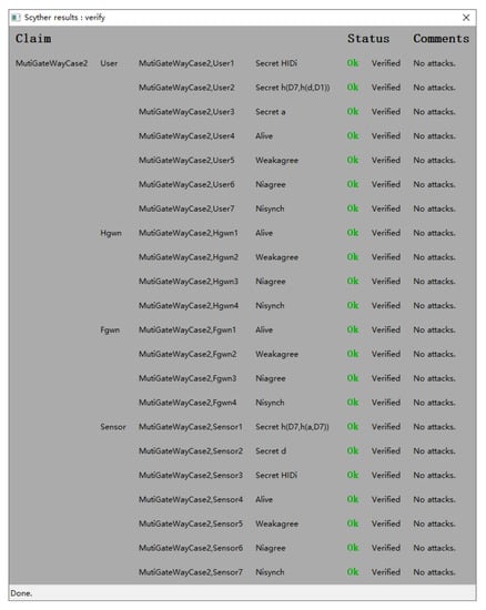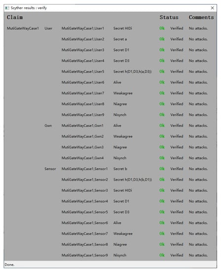 3. Scyther, an automated security protocol verification tool [], is used to simulate and analyze the proposed protocol. The result demonstrates that the scheme is correct and secure against many adversary models.