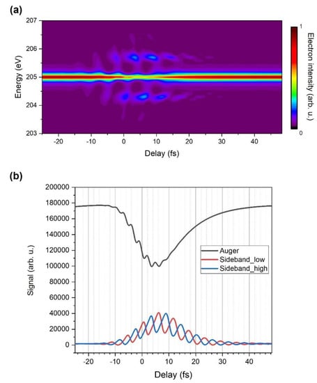 Theoretical calculation [23]. (a) Simulated streaking spectrogram of an argon Auger decay channel. (b) The envelopes of the calculated Auger and sideband lines.