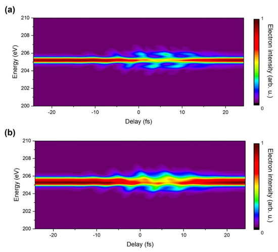 Figure 3a shows the calculated argon Auger electron spectrogram convoluted with the spectral resolution of the TOF. The measured spectral resolution is about 0.5 eV at 205 eV when the retarding potential was set to 190 V. The kinetic energy of the argon Auger electron for one of the interest channels is 205.21 eV. The Auger peak and sidebands are broadened along the energy axis due to the convolution effect compared to Figure 2a. Figure 3b shows the calculated two closely spaced Auger peaks, 205.21 eV and 205.62 eV, taking into account the differences in their intensity coefficients. The merged spectra show an oscillation at the IR laser frequency, although it is hard to resolve the two peaks due to the limited energy resolution of the experimental setup.
