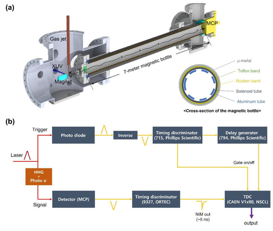 Figure 5a indicates a schematic drawing of the spectrometer. The focused XUV beam ionizes the core electron of argon molecules injected from a gas jet. A strong permanent magnet with a conical pole piece produces a diverging solid magnetic field. The strong magnetic field drives the photoelectrons to collimate. A portion of the collimated photoelectrons enter the aperture of the spectrometer, and the constant magnetic field of the flight tube guides the photoelectrons along the seven-meter-long TOF spectrometer. A solenoid coil covered by an inner aluminum tube produces a constant magnetic field inside the tube. The whole tube is covered by a μ-metal tube to shield the earth’s magnetic field. To protect the solenoid coil, multiple rubber bands and Teflon bands are placed between the solenoid tube and the μ-metal tube.