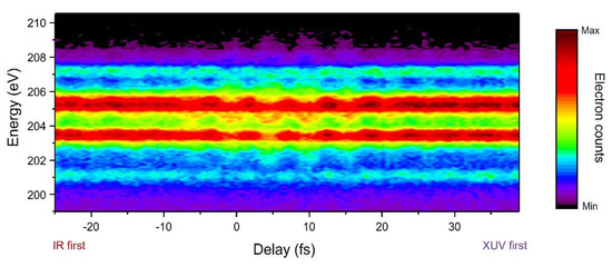 Figure 7 shows the evolution of electron spectra following core excitation. The spectra were recorded after exposure of argon atoms to a 200-attosecond soft X-ray pulse and a femtosecond IR pulse at different delays between them. A negative delay corresponds to an earlier IR pulse arrival. The plot shows the evolution of the L2,3M2,3M2,3 Auger lines with delay. The IR laser peak intensity was evaluated as . The IR laser field spreads the kinetic energy of the Auger electrons and induces clear sideband structures. The evolution of the first-order sidebands of the two strong Auger peaks (203.5 eV and 205.2 eV) shows strong modulation along the delay. The Auger peak of 207.2 eV also oscillates with the same frequency and phase as the two strong peak’s oscillation. It means that the Auger electrons from these channels have the same initial phase. The peak at 201.1 eV is too weak to see any clear structures.