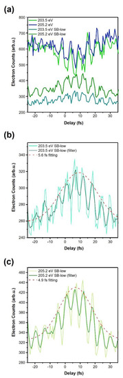 Figure 8a shows the measured electron counts of two strong Auger peaks and corresponding sidebands along the delay. The sideband at 202.8 eV (203.5 eV SB-low) is the first-low-order of the Auger peaks at 203.5 eV. The sideband at 204.5 eV (205.2 eV SB-low) is the first-low-order of the Auger peaks at 205.2 eV. According to the theoretical results, higher and lower order sidebands are out of phase. Two neighboring Auger peaks may affect the oscillation of Auger peaks along the delay because one Auger peak’s sideband signal may merge with the other Auger peak. Figure 8b shows the extracted argon Auger decay time (τh) of the 203.5 eV peak (L3M2,3M2,3(1D2)) is 5.6 fs. The measured decay time of the 205.2 eV peak (L3M2,3M2,3(3P0,1,2)) is 4.9 fs (Figure 8c). The sideband profiles are fitted by the convolution of the Auger decay rates and the IR pulse envelope functions. The values of the delay axis are changed for a fitting. These values correspond to linewidths (Γ =h/τh) of 117 meV and 134 meV. The extracted linewidths are in good agreement with the spectroscopic measurement, which reported that the measured inherent lifetime widths from the spectroscopy of the Ar 2p1/2 and Ar 2p3/2 are both 118 meV [30]. There is no difference in the inherent lifetime width for the spin-orbit split components of Ar 2p ionized states. The extracted lifetimes of the multiple Auger signals with similar envelopes also agree with [30].