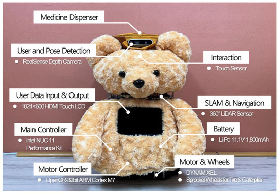First, regarding the appearance of the elder care robot, we chose the concept of a teddy bear, common in homes, because older people have historically tended to prefer furry, compact doll-type robots that exhibit emotional stability similar to PARO-type robots. Figure 2 shows the appearance and configuration of our developed care robot, Dori, which is equipped with a microphone, speakers, sensors, and a medication dispenser. Dori features a 2D 360° LiDAR, Intel RealSense camera, and touch LCD on the Turtlebot 3 Waffle Pi robot platform by Robotis.