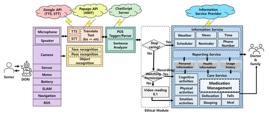 Dori’s software architecture consists of five units: system input/output, voice and image recognition, chatbot processing, service setting, and service content.