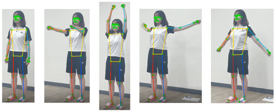 Figure 4 shows that MPP successfully extracts the overall coordinates of 33 landmarks of each image for the motion of raising the arm upward and then lowering it to the side. In the figure, it can be seen that the joint coordinates of the upper body dynamically change, but the joint coordinates of the lower body are almost fixed. Figure 5 shows the corresponding normalized pixel distance profiles of the positions in shoulder, elbow, wrist, hip, knee, and ankle joints for this motion. Comparing the fluctuating profiles of the elbow and wrist joints with others, 0.05 is determined as a good criterion for distinguishing between active and static joints, which can be applied to detecting sudden movement of the older adult. When body movement is detected, the pose recognition function is activated.