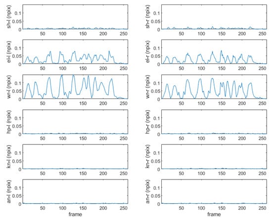 Change distance profiles of left (l)/right (r) shoulder (sh), elbow (el), wrist (wr), hip (hp), knee (kn), and ankle (an) joint landmark positions in normalized pixels (npix) for the motion in Figure 4.