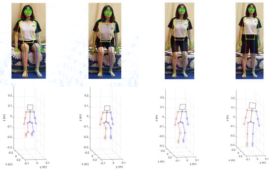 Figure 6 shows the results of the MPP execution for the sitting and standing up motion images in the upper row and the corresponding 3D humanoid poses fitted to the 2D images by uDEAS in the lower row. Figure 7 shows the angular trajectories of the shoulder, elbow, hip, knee joints in the sagittal plane identified for this motion. In the figure, it is clear that the hip and knee joints reach about 70 degrees at frame 20, expressing a sitting motion with the humanoid model, and return to zero for a standing motion.