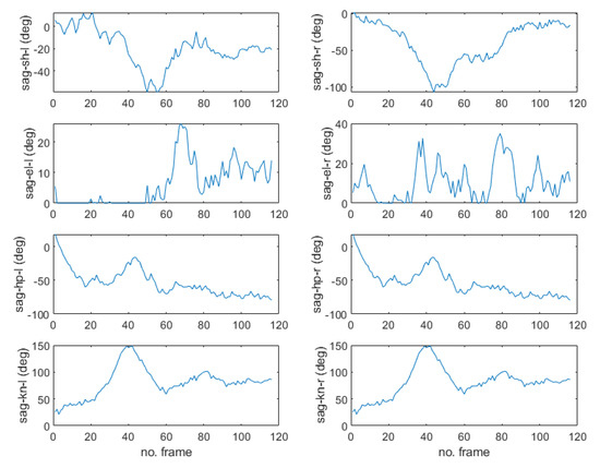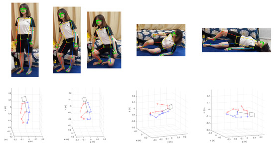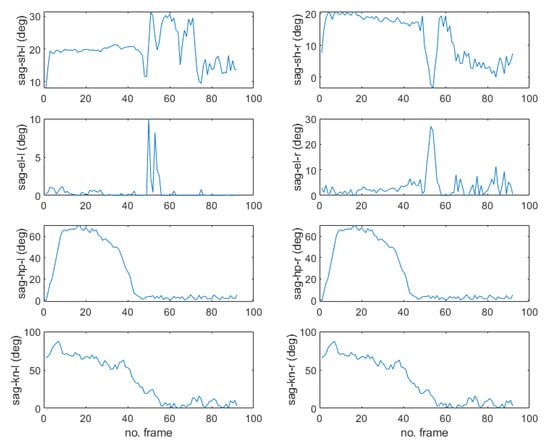 For validation of the pose recognition performance, we try to recognize a sudden falling motion as shown in Figure 8 and Figure 9. The images captured in Figure 8 and the poses of the humanoid simulation match well, and the estimated joint angle trajectories plotted in Figure 9 has apparently different feature compared to Figure 7. Specifically, the fact that the hip joint angle in the sagittal plane changes from 0 degree (standing) to −70 degrees (abnormal) means that the older adult is more likely to fall to the floor. As such, other poses can be recognized based on the representative joint angle profiles for Dory’s monitoring service.