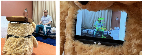 Left: Dori and the user under monitoring service. Right: Skeletal model is extracted from camera image using MediaPipe Pose.