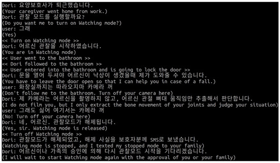 Figure 11 shows an example of the flow of a Dori’s chatbot conversation conducted with STT and TTS via Google Assistant API, a service scenario written in ChatScript, and the application of Papago NMT for language translation. The Korean sentences in Figure 11 are translations of the parenthetical English sentences, which are the responses that are actually coded into the service scenario in ChatScript. Since the present services use Korean, Papago NMT is necessary for respectful conversation or requests by Dori, as the Korean language has honorific expressions for the elderly or people of high status.