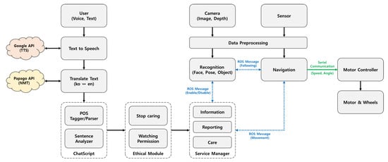 The LiDAR performs simultaneous localization and mapping [18] and navigation [19] required for autonomous driving. The camera conducts facial recognition, posture recognition, and object recognition required for user identification and service performance. The Intel NUC 11 Performance Kit is adopted as the main controller. The entire system is based on the Robot Operating System (ROS) [20] and uses the open-source control module OpenCR to control the wheels’ motors. In addition, Dori’s software framework is developed by connecting and integrating the cognitive agent architecture Soar [21], chatbot engine ChatScript [22], DB management system SQLite [23], and cloud system and open-source packages for voice and image recognition processes.