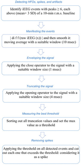 This study presents a method for using an efficient one-dimensional morphological filter by introducing closing and opening operations on removing spikes and sharp transients from ictal electroencephalography (EEG) signals. Spikes and sharp transients can appear in brain signals due to many reasons, such as physiological features coming along with some brain diseases, for instance, epilepsy, or maybe artifacts [21,22,25,28]. While in some other brain cases, for instance, cognitive task, vision, movement, epilepsy, etc., high frequency true ripples are used as a biomarker [42,43,44,45]. Therefore, in these cases, removing spikes and sharp artifacts, which cause false ripples, is required [46,47]. In fact, initially detecting true ripples using any algorithm required a band-pass filter; therefore, any sharp signal passing through this filter would be presented as a false ripple which is due to the ringing effect of this filter. As a result, these false ripples would affect the outcomes and cause medical misrepresentation [46].