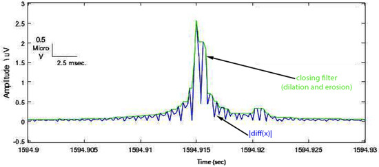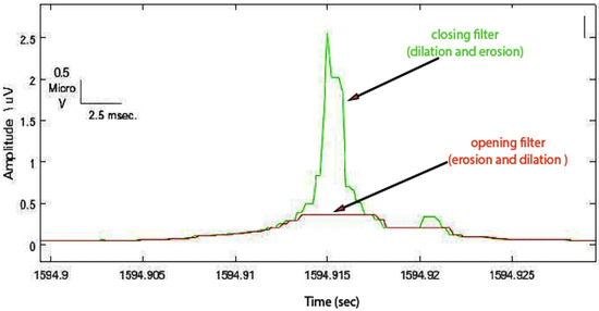 The purpose for using the morphological filter is to define a suitable threshold in order to distinguish between the background signals and spikes [95,96]. The novelty here is to select a dynamic threshold that depends on the shape of the spikes instead of choosing it by applying an arbitrary fixed threshold over the entire EEG recording. The most morphological filter operations applied here are closing (dilation, then erosion), and opening (erosion and then dilation). The erosion and dilation operations can be framed receptively as (1) and (2) [97]: