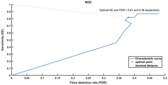 However, since the window size of the opening filter is crucial in term of determining the optimal threshold, so instead of choosing it as an arbitrary value (1 ms mentioned earlier), we tried to find a way to identify it. We used the training set and repeated step 4 with different window sizes (1–8) ms and measured SE and FDR for each one. Then, we plotted the receiver operating characteristic curve (ROC) and measured the Euclidean distance between the optimal sensitivity and FDR point (0, 1) (0% FDR, 100% SE), and individual sensitivity and FDR of each window size in order to find the shortest distance and mark the best operation point.