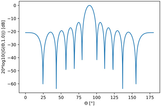 When choosing the amplitude value for the contribution, we must consider the available output power for the beampattern in that interval. Looking at Figure 1, if we want to design a broader main lobe for , we need to distribute the energy in a broader angle interval. Consequently, this will result in a lower maximum peak height. To tune the amplitude values of to an amplitude height that preserves the available energy of the beampattern , we performed the following energy tuning procedure:
