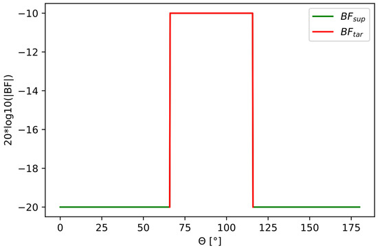 where was the desired main lobe, and was the desired sidelobe suppression. The amplitude values of the mask describe the amplification of the beam in a given direction. Here, we give an example of the beampattern mask design: