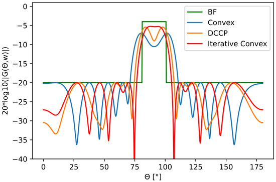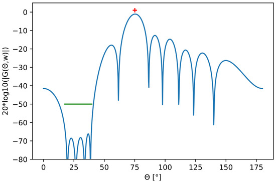 The optimization variable is the weight vector w, is the desired transmit direction, is the optimized beampattern, and is the angular interval where we want the beampattern to be suppressed. Figure 3 shows an example of an optimized beampattern with the attenuation marked out as a straight green line. To ensure that the optimization is convex, is a constant. The absolute value of the complex weight is set as less than or equal to one to fulfill the unit modulus constraint.