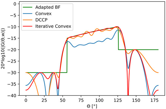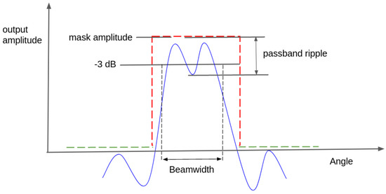 We employed the definition of a passband ripple from digital filter design, where the ripple is defined as fluctuations in the passband of the filter’s frequency magnitude response. In our case, the passband ripple was instead defined as the beampattern fluctuation within the angular interval for the main lobe of the desired beampattern mask (). We describe the passband ripple as the maximum deviation from the desired beampattern mask in dB within the main lobe region; see Figure 4 for an illustrated example.