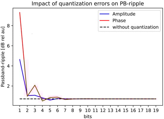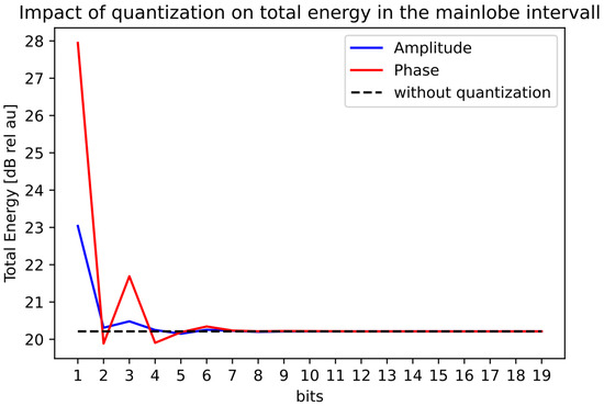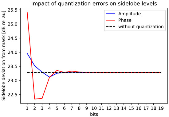 Using the ramp beam pattern from Figure 7, we used the iterative-convex optimization method and visualized the results of the effect of the limited accuracy of the bits in amplitude and phase for MAE, PB-ripple, the total energy in the mainbeam, and the sidelobe levels, see Figure 8, Figure 9, Figure 10 and Figure 11. The dotted black lines in the figures show the values achieved without quantization. Figure 8 shows the MAE for different quantization values in the main-lobe interval. Figure 9 shows the PB-ripple within the main lobe interval for different levels of quantization. Figure 10 shows the total measured energy in the main lobe interval for different levels of quantization. We can see that, at around 8-bits of quantization of the phase, the results converged to the same value as the ideal non-quantized case. The 8-bit phase quantization corresponded to an angular resolution of . The quantization of the phase was more sensitive than the quantization of the amplitude. For the amplitude quantization, it was sufficient with only 5 bits to reach the non-quantization level of performance.