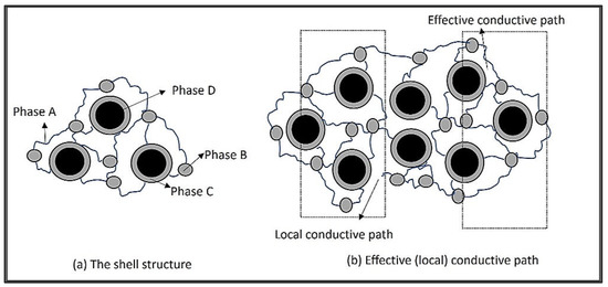 The schematic diagram for the shell structure where phase A is a rubber molecule chain, phase B is the crosslinking between the rubber chains, phase C is a macro-rubber that is absorbed by the carbon black surface, and phase D is the carbon black nanoparticle. (a) The effective (local) conductive path (b) of a nanocomposite [32].