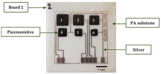 Regarding the top of the PA substrates, a configuration of six sensors was produced with dimensions ranging from 100 to 25 mm2 and a typical thickness in the range of 30 μm, to allow for exploring the most reliable sensor size (Figure 2). A limited sensor dimension is here important to investigate, taking into account that multiple sensing elements (from 3 to 6 in count) will be applied on the prosthetic and/or guide surface to ensure optimal positional accuracy. Three samples of the sensor configuration were made to check for repeatability and to mitigate uncertainty. The sensor circuit consists of Aerosol Jet®-printed silver lines and pads, which act as interconnects, whereupon piezoresistive electrodes are screen-printed to provide the active material, from which the resistance will change in the function of the applied pressure.