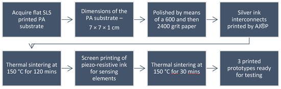 Secondly, the piezoresistive pressure elements were manually screen-printed (by using a stainless-steel stencil), using the Carbon EMS CI 2050 ink with the help of a squeegee. According to the data from the ink supplier and the experiments conducted on the PA substrate, an optimal ratio of 60 wt% CI-2050 HR: 40 wt% CI-2050LR was found. This viscous ink was hand-stirred for a minimum of 5 min. Two layers were printed with a 30 μm thick stainless-steel screen to reach uniformity and avoid unwanted gaps in the printed pattern. The screen and the squeegee were cleaned with MEK (ketone) solvent. Next, thermal sintering was applied in an oven at 150 °C for 30 min. Figure 3 provides the process and production flow for the sensor’s prototype manufacturing.