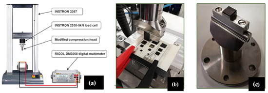 (a) Picture of the experimental bench connected with a digital multimeter for sensor testing; (b) non-conductive tape and crocodile clamps; (c) rubber patch on the compression head.
