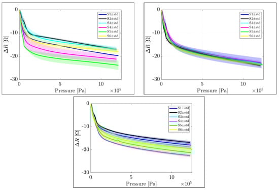 Figure 5 plots the measured change in resistance (ΔR[Ω]) versus an increasing ramping pressure per sensor dimension and sample replicas over the three boards. A zero-set was applied to each sensor signal to compensate for the parasitic resistance, as a function of the initial sensor conditions (R0) and intrinsic particle resistance (Rc). The pressure signal was calculated as the increasing force ramping signal (from 0 to 125 N, see Section 3.3) divided by the area of the sensing layer. Each plot in Figure 5 refers to each manufactured board. Each board contained six curves that corresponded to the six sensing elements. Each curve was a mean of three repetitions. The shaded region shows the standard deviation of the response of each sensing element on each board.