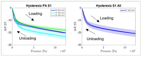 Figure 6 shows the hysteresis data measured by applying a loading and unloading signal (ramping test of the type 0–125–0 N; i.e., 0–1.25–0 Mpa). The data are reported for the largest sensors (sensor 1) only and the average behaviour, as representative of the general response. The sensor hysteresis was minimal in one cycle and only presented in the high sensitivity region.