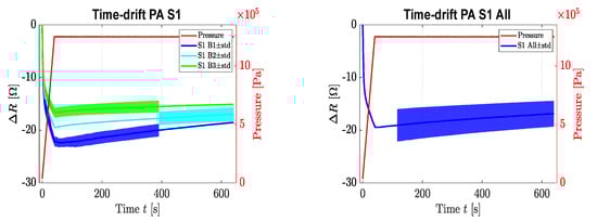 During the time drift test, sensor one of each board was exposed to a force that increased from 0 to 125 N (0–1.25 MPa) with a compression rate of 3 N/s (30 KPa/s). Afterward, the force was kept constant at 125 N over a period of 600 s. The change of resistance in the function of time is illustrated in Figure 7, along with the combined time drift data of sensor one for all boards combined. Around 13% of the change of resistance (ΔR [Ω] vs. s) for 600 s was reported. No longer time duration was needed due to the demand of our application.