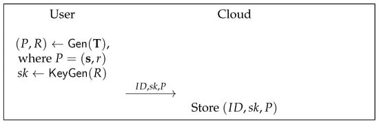 - To register a device, a user (on behalf of of the device) interacts with the cloud. The user creates an identity and a time schedule , and generates a helper data P and a secret key . The user sends to the cloud for device registration. At the end of device registration, the cloud stores the and allows a controller to access it. This protocol is depicted in Figure 2.
