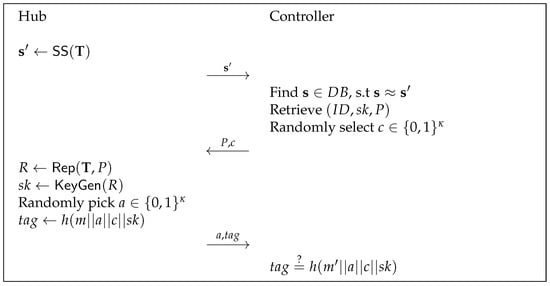 - A hub firstly obtains the timing information when it receives the sensing data from a sensor and compiles a sequence of the time information to . Note that the time information is considered as noisy data that contains random differences. Then, the hub performs the secure sketch algorithm with input to generate a new sketch . The hub sends to the controller.