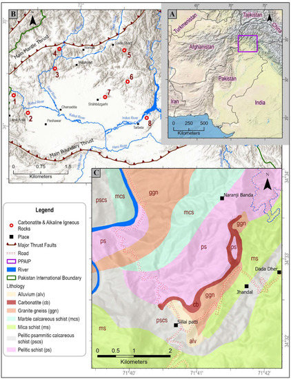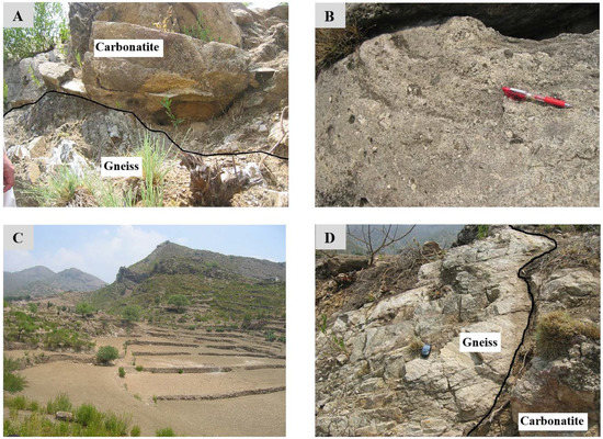 Sillai Patti carbonatite, which outcrops about 70 km north of Peshawar, was first reported by Ashraf and Chaudhry [66]. The carbonatite body is 2–20 m wide and 12 km long and has a thrusted contact with a Paleozoic gneiss and metasediments (Figure 1C).