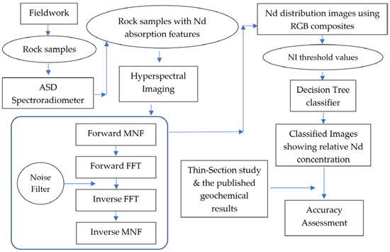 Flowchart showing the methodology adopted in the study (ASD: Analytical Spectral Device; FFT: Fast Fourier Transform; MNF: Minimum Noise Fraction; NI: neodymium index).
